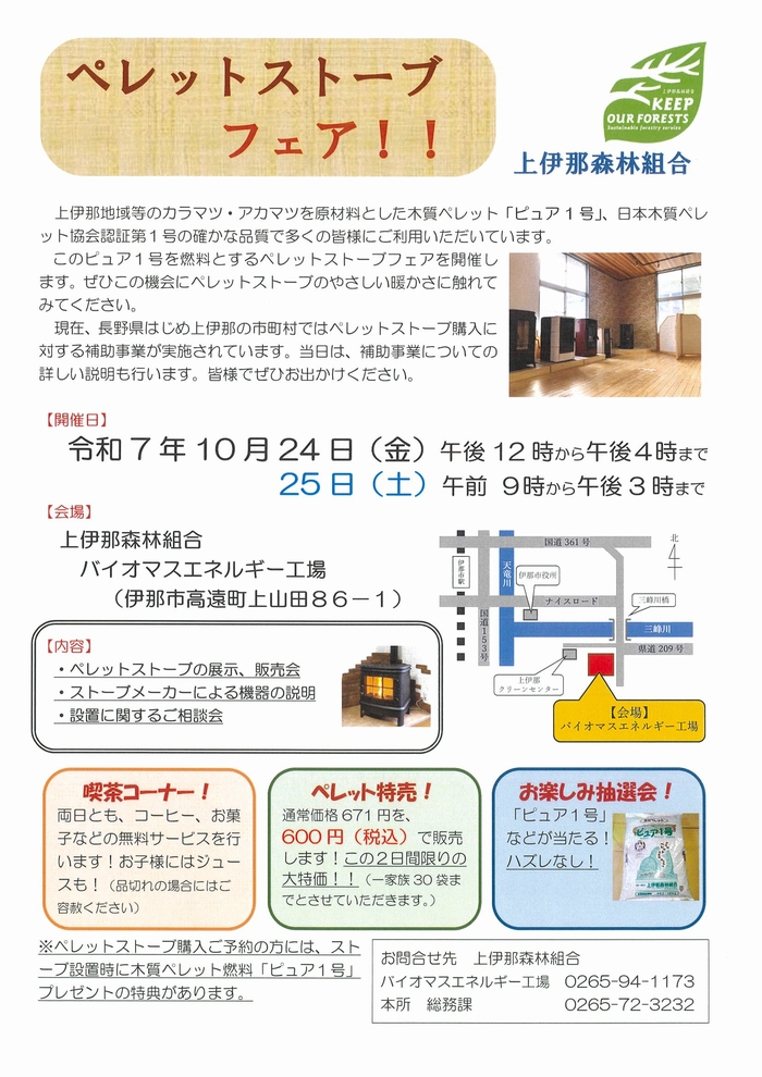 | 内容 | 上伊那地域等のカラマツ・アカマツを原材料として木質ペレット「ピュア1号」を燃料とするペレットストーブを開催します🔥