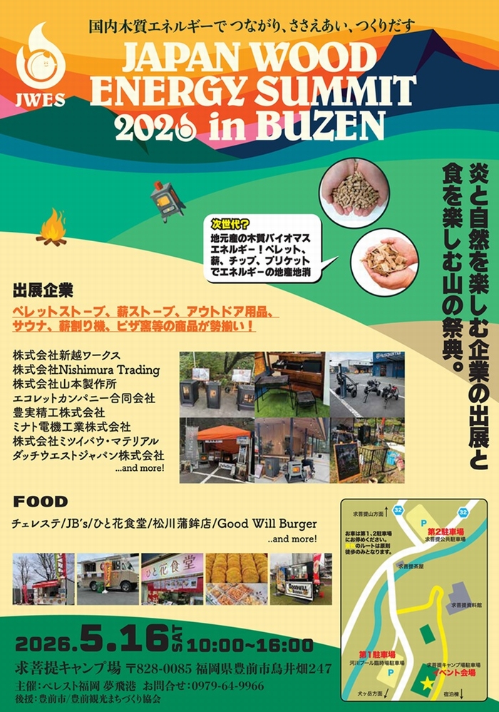 | 内容 | ―国内木質エネルギーでつながり、ささえあい、つくりだす― 炎と自然を楽しむ企業の出展と食を楽しむ山の祭典『JAPAN WOOD ENERGY SUMMIT 2026 in BUZEN』が開催されます🔥 主催者様のご協力のもと、ウォームアーツも各機種展示させていただきます! ≪ウォームアーツ展示機種≫ 輻射タイプ RS-4 輻射タイプ RS-mini 温風タイプ SS-5Plus スタッフが常駐しておりますので、お聞きになりたいことなどございましたらお気軽に声掛けください!