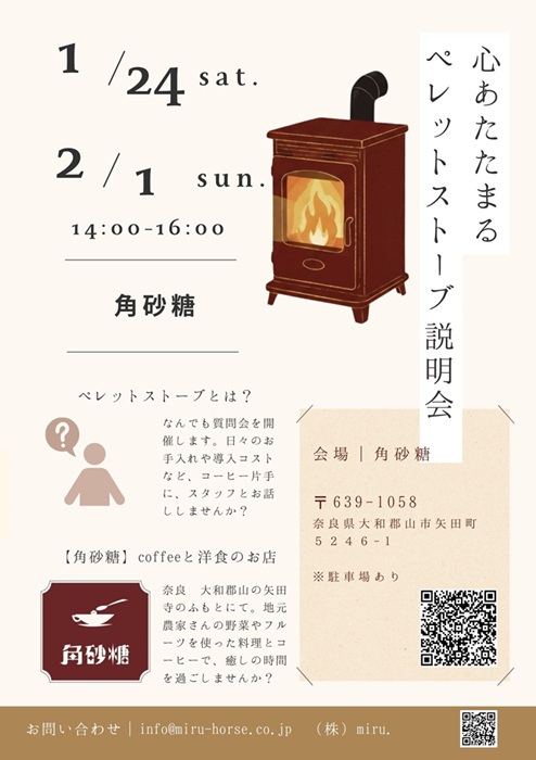| 内容 | ペレットストーブ体験会を コーヒーと洋食のお店【角砂糖】様にて開催いたします🔥 奈良 大和郡山の矢田寺のふもとにあるお店です。 地元農家さんの野菜やフルーツを使った料理とコーヒーで癒しの時間がお楽しみいただけます。